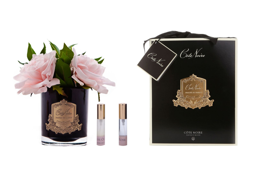 Cote Noire Premium English Roses Pink Black Glass with Gold Crest