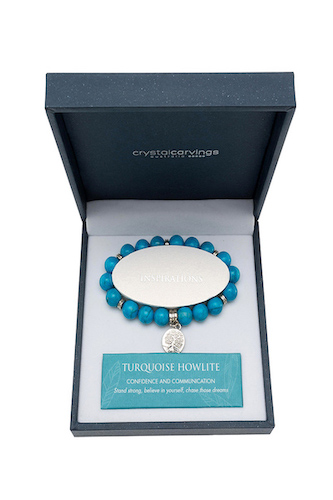 Turquoise Howlite gives the gift of communication and deep friendships. Each design has the meaning of the natural stone and a special "Inspiration" message and comes beautifully presented in quality jewellery box. The tree of life charms and fixings are made from stainless steel and the high quality semi-precious gemstone beads are strung on elastoma. Inspiration - A single rose can be my garden, a single friend my world